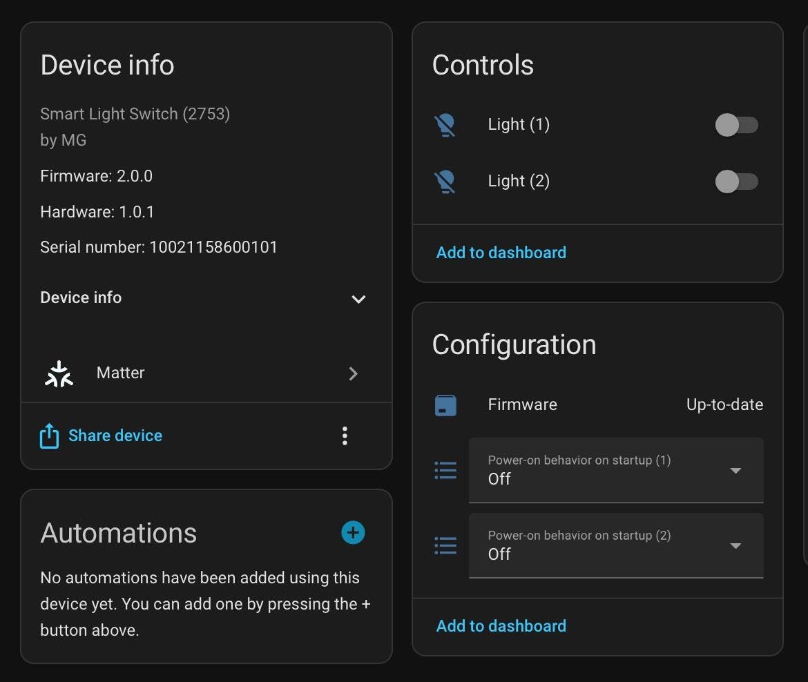 Matter integration with Home Assistant is less than ideal, Appears the firmware is "A Light Switch", not an "Outlet". The GPO appears as a Matter light switch in Home Assistant and allow turn on and off of the outlet, but does not even provide the sensors for power consumption at all. Hoping some action by OzSmartThings (awesome people) and the manufacture sort out this design problem.